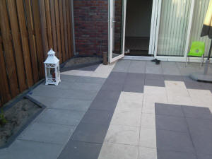 Ontwerp in overleg gemaakt met opdrachtgever. In dit project is gebruik gemaakt van gebruikte betontegels en nieuwe gekleurde betontegels met opsluitbanden rondom. Doel was een functionele tuin te ontwerpen voor ouders & kinderen waarbij rekening is gehouden met zo min mogelijk onderhoud. Terug naar het projectoverzicht